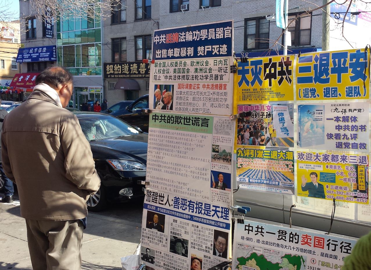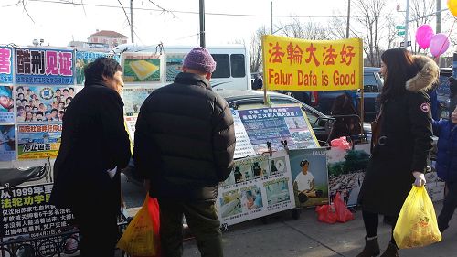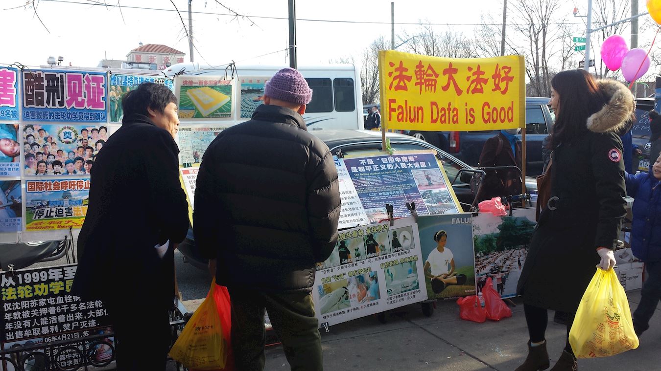 | 【明慧网二零一七年一月三十一日】(明慧记者采菊纽约报道)布碌仑八大道是纽约第三大华人社区,一到节假日,这里就非常热闹,附近的华人们都会来这里逛街采购,会亲访友。法轮功学员的真相展位每个周末都在这里告诉人们法轮功真相,展板图片、各种真相小册子和真相光盘,内容丰富,“法轮大法好”的横幅非常醒目。 二零一七年一月二十九日,大年初二,布碌仑的法轮功学员特地定制了喜庆的节日气球赠送给前来庆祝新年的华人朋友们,同时告诉他们三:退.保平安(退出中国共产党,共青团和少先队员,简称三:退.)的好消息。  图1~3:大年初二,法轮功学员们在热闹的布碌仑街上向民众传递真相,很多华人民众驻足阅读真相展板 |