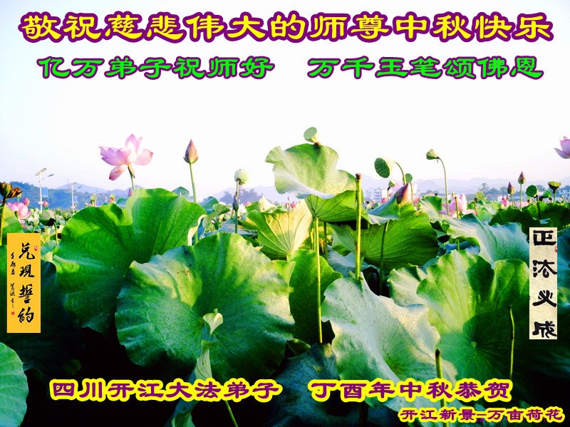 虽然我们知道师尊就在我们身边,但是我们还是非常想念师尊!不管出现什么样的形势变化,我们都不会懈怠,还是努力做好三件事,救度更多的众生。我们会听师尊的话,多学法、学好法,修好自己,真正的助师正法。跪拜合十 四川开江大法弟子敬贺慈悲伟大的师尊中秋快乐!