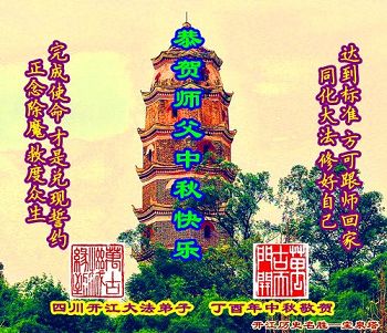 得法十九春, 佳节忆师恩。 实修证实法, 正念救人归。 四川德阳一弟子敬贺 丁酉年八月初六 四川省内江市威远县大法弟子全家恭祝慈悲伟大的师父中秋节快乐!