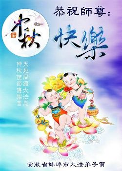 黄山市女大法弟子恭祝师尊中秋节快乐! 每当佳节倍思亲,中秋花好月圆的时节就要到了,弟子想念师尊,也想念曾经在一起的同修。同修啊,希望你能看到或听到我的心声,希望你能忆起来时的大愿。人身难得,中土难生,正法难遇,全此三者,幸莫大焉。我们曾经都是无比幸运的能得了大法的生命,你也曾经为了卫护大法放下生死,也曾为反抗迫害绝食半月……曾经可歌可泣的篇章都留在了宇宙历史的抹不去的记忆中。而今,为何你误入歧途?难道你觉的不学法只炼功或不炼功,不救人,兼看它门的东西(犯“不二法门”之戒),不按师父要求做好三件事也算是师父的弟子吗?快醒醒啊同修,师尊在用无法想象的承受为我们延续着时间,师父不想落下一个弟子,师父在等待着我们,你知不知道?再不跟上师父正法的進程,当真相大显之时,我们悔已晚也。 安徽省宿州市砀山县大法弟子恭祝慈悲、伟大的师尊中秋节快乐!