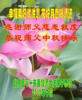幸福美好谢洪恩,花好月圆盼师还! 感谢师父慈悲救度!祝师父中秋快乐! 北京昌平一夫妻教师大法弟子恭祝 2017年中秋 吉林省长春教育系统大法弟子恭祝师尊中秋快乐!