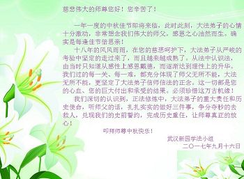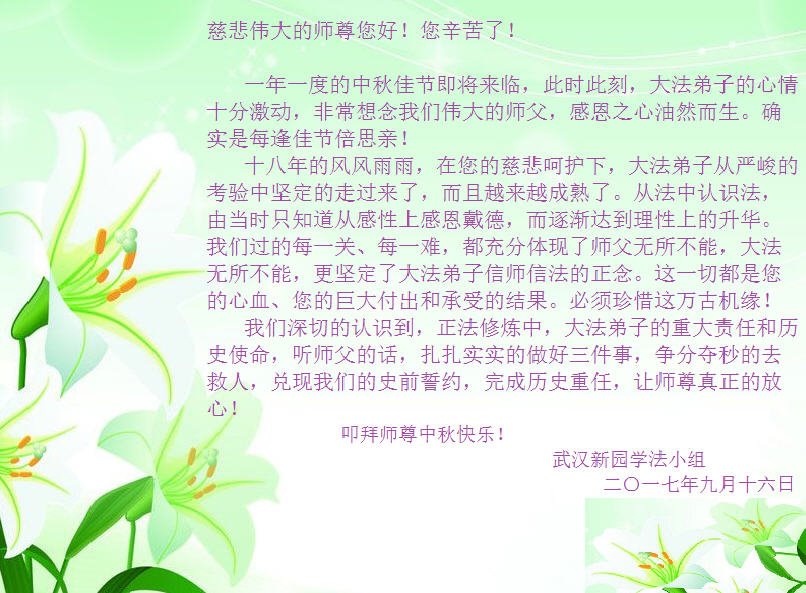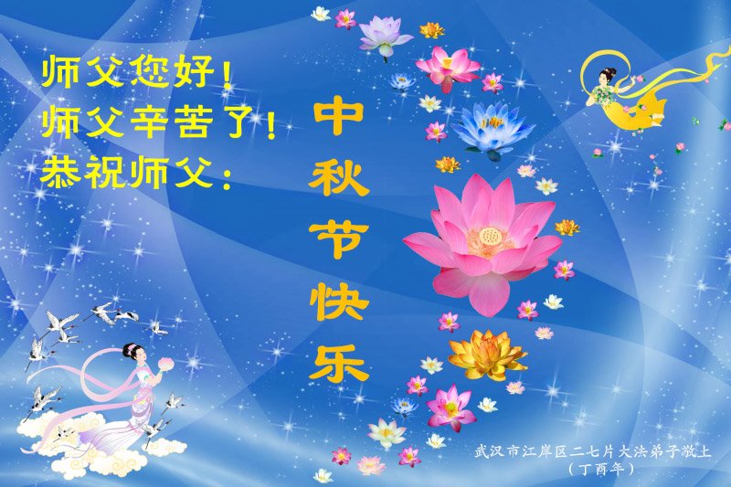 【明慧网二零一七年十月一日】 湖北省武汉市江岸区二七片全体大法弟子恭祝慈悲伟大的师尊中秋节快乐!