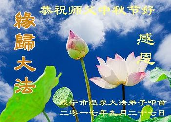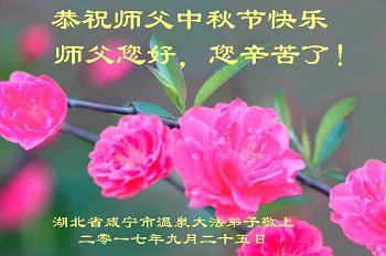 尊敬的师父: 您好! 中秋节即将来临,弟子感恩师父为我们铺垫了返本归真之路,在反迫害中,在讲清真相救度众生中,都是师父的保护,把有缘人一个一个的引领到弟子跟前,让众生明白大法真相从而得救,有好的未来,给弟子成就未来美好的一切。在此弟子千言万语也说不尽师父的慈悲和苦度,只有在修好自己的路上更加精進再精進。 恭祝师父:中秋节快乐! 大法弟子 湖北咸宁温泉一大法弟子恭祝师父中秋节快乐!
