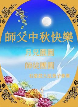 感谢师尊将宇宙大法传于我们,弟子们一定学好法,按照大法的标准严格要求,向内找提高心性,踏踏实实的修好自己,多救人,完成自己的历史使命。 北省河北省石家庄市长安区大法弟子恭祝师父中秋节快乐!