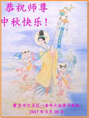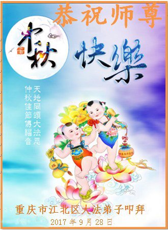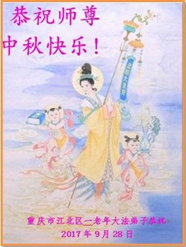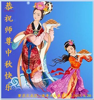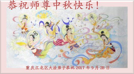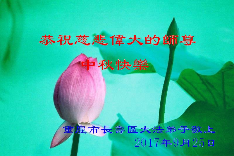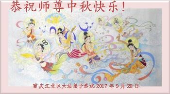 在二零一七年中秋节来临之际,重庆涪陵一片区全体大法弟子恭祝慈悲伟大的师尊中秋节快乐! 在正法的最后时刻,我们要去掉对时间的执着,牢记自己的使命,努力做好三件事,助师正法,救度众生,兑现自己的誓约,跟师父回家! 2017年9月26日 重庆市一大法弟子恭祝师尊中秋节快乐!