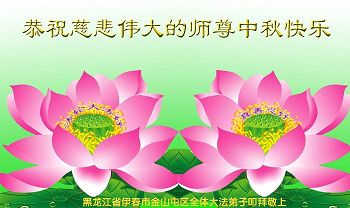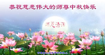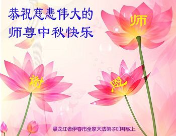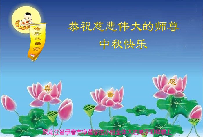 黑龙江省伊春市全家大法弟子恭祝慈悲伟大的师尊中秋快乐! 在每逢佳节的日子里 我们遥寄感恩送到异国他乡 在家家团聚的日子里 我们突破网络的重重封锁寄到明慧网 师尊啊师尊 您为我们承受了太多太多 我们用尽全人类的语言也诉不尽您的呵护无限 师尊啊师尊 您为众生付出了太多太多 我们用尽语言也表不尽您的慈悲无量 师尊啊师尊 您为众生操劳的太多太多 海做墨松做笔也述不完您的洪恩浩荡 在这中秋佳节的日子里 我们全家用心送上最诚挚的恭贺与祝愿 恭祝师尊中秋快乐! 黑龙江省伊春市全体大法弟子恭祝慈悲伟大的师尊中秋快乐!