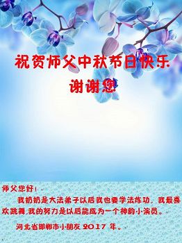 慈悲伟大的师尊:您辛苦了!中秋佳节即将来临之际,我们黑龙江省汤原县全体大法弟子向您敬拜,致以节日问候!我们时刻想念您,我们将一如既往的努力修好自己,抓紧救人,加强正念,走好最后的回归路。 河北省邯郸市小朋友祝贺师父中秋快乐!