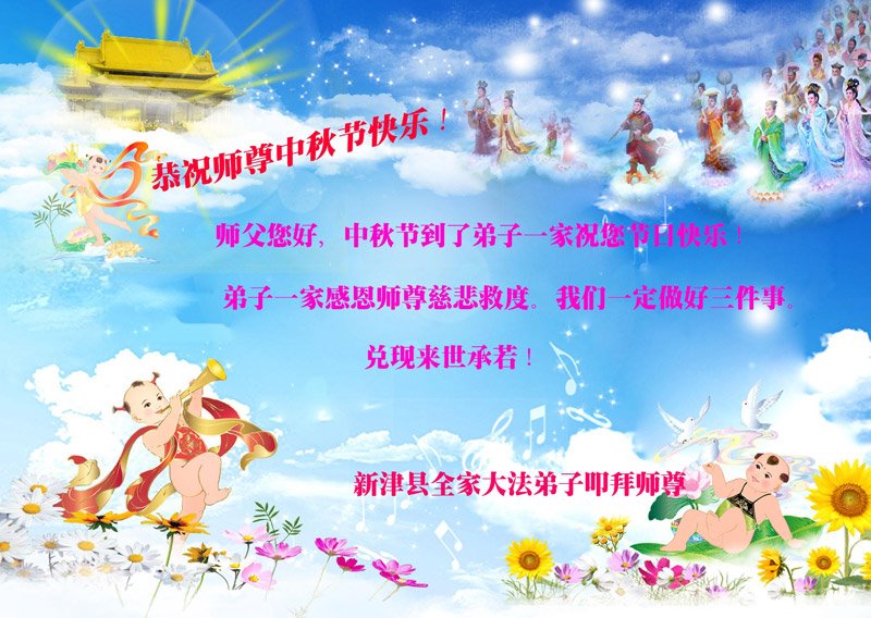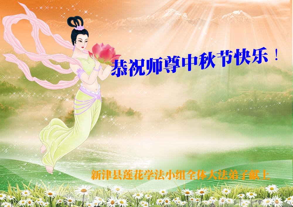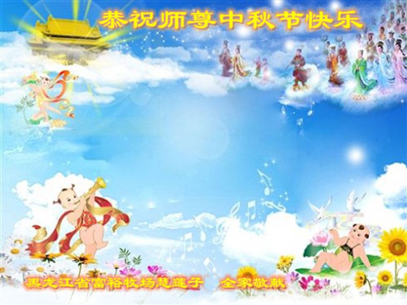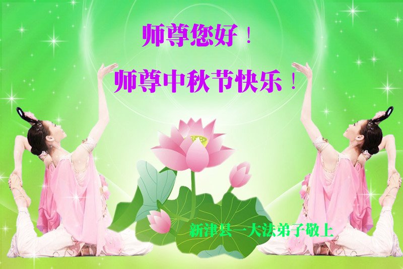 师尊您好!师尊您辛苦了!中秋节到了,在这团聚的时刻,弟子全家恭祝师尊 节日快乐!感恩师父的救度,谢谢师尊时时的呵护!弟子一家用尽人间的千言万语也无法 表达对师尊的感恩,弟子唯有多学法,修好自己,做好三件事,不辜负师父的慈悲 救度。弟子一家牢记师尊的教诲,无论在任何情况下,都以法为师,修好自己,兑现来世大愿。谢谢师尊!弟子全家叩拜师尊! 四川省成都市新津县莲花学法小组全体大法弟子恭祝师尊中秋节快乐!