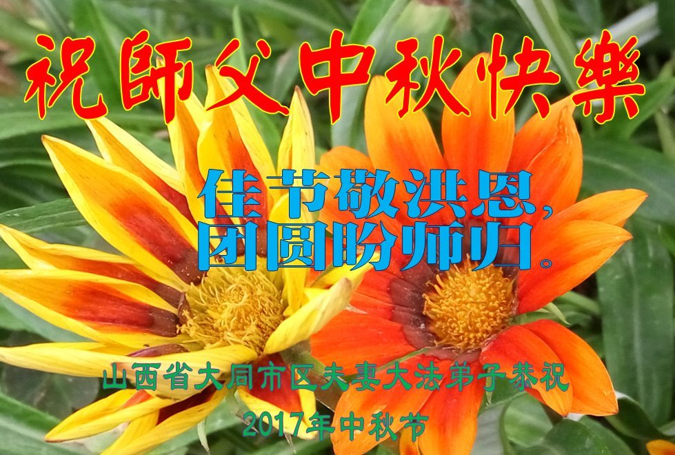 佳节敬洪恩,团圆盼师归。 感谢师父慈悲救度!盼望师父早日回到中国! 2017年中秋节 山西省大同市学法小组大法弟子恭祝师尊中秋快乐!