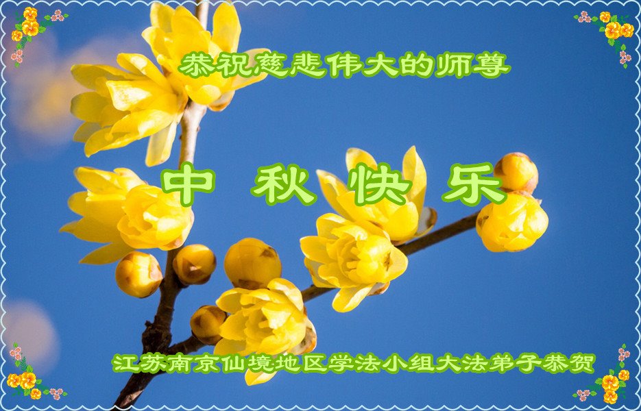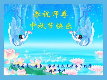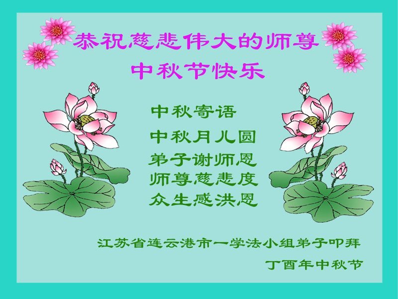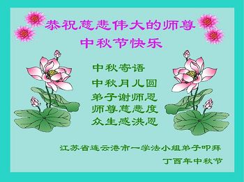 师父!您好,您辛苦了!中秋佳节来临,弟子们思念师父!正法進程突飞猛進,在最后的时刻,弟子们会严格要求自己,真正学好法、实修自己,彻底去掉自己的根本执着,时刻用师父教给弟子们向内找的法器归正自己,破除旧势力的险恶安排,坚决走师父您安排的修炼路,做好三件事,多救人,做一个合格的正法时期的大法弟子,弟子们一定会做到。真正让师父少一份操劳,多一份欣慰,弟子们无限感恩师父的慈悲苦度,谢谢师父! 江苏省泰州市靖江全体大法弟子叩拜! 江苏一夫妻大法弟子恭祝师尊中秋快乐!