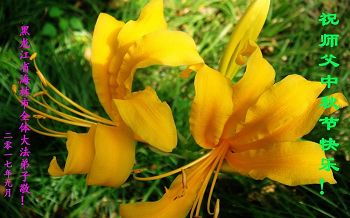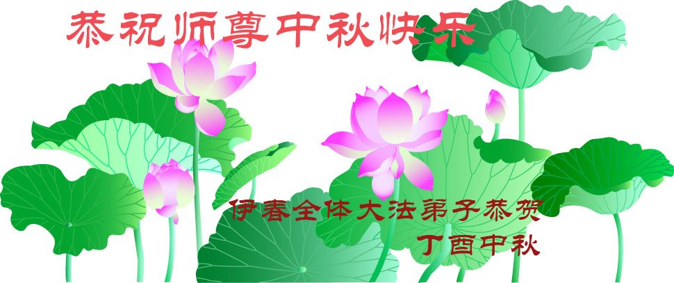 八月十五月高悬,对月遥谢师尊恩。 祝师父中秋快乐! 黑龙江省伊春市祖孙三大法弟子 中秋佳节倍思亲,大法弟子想念您! 黑龙江省伊春市全体大法弟子祝师尊中秋快乐! 中秋佳节到,遥祝师尊好! 黑龙江省伊春市区河西学法小组大法弟子向师父致敬 |