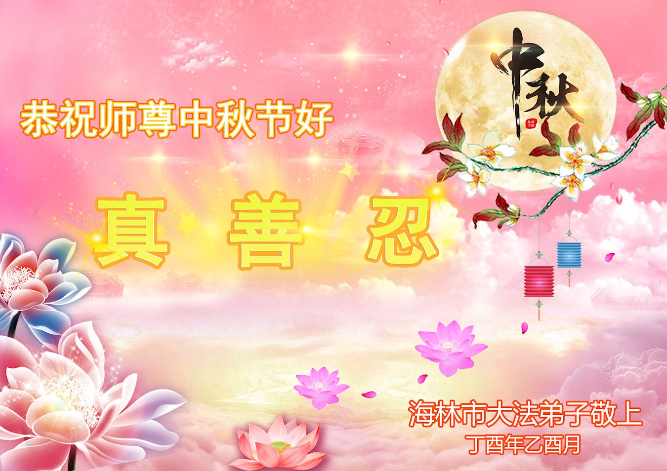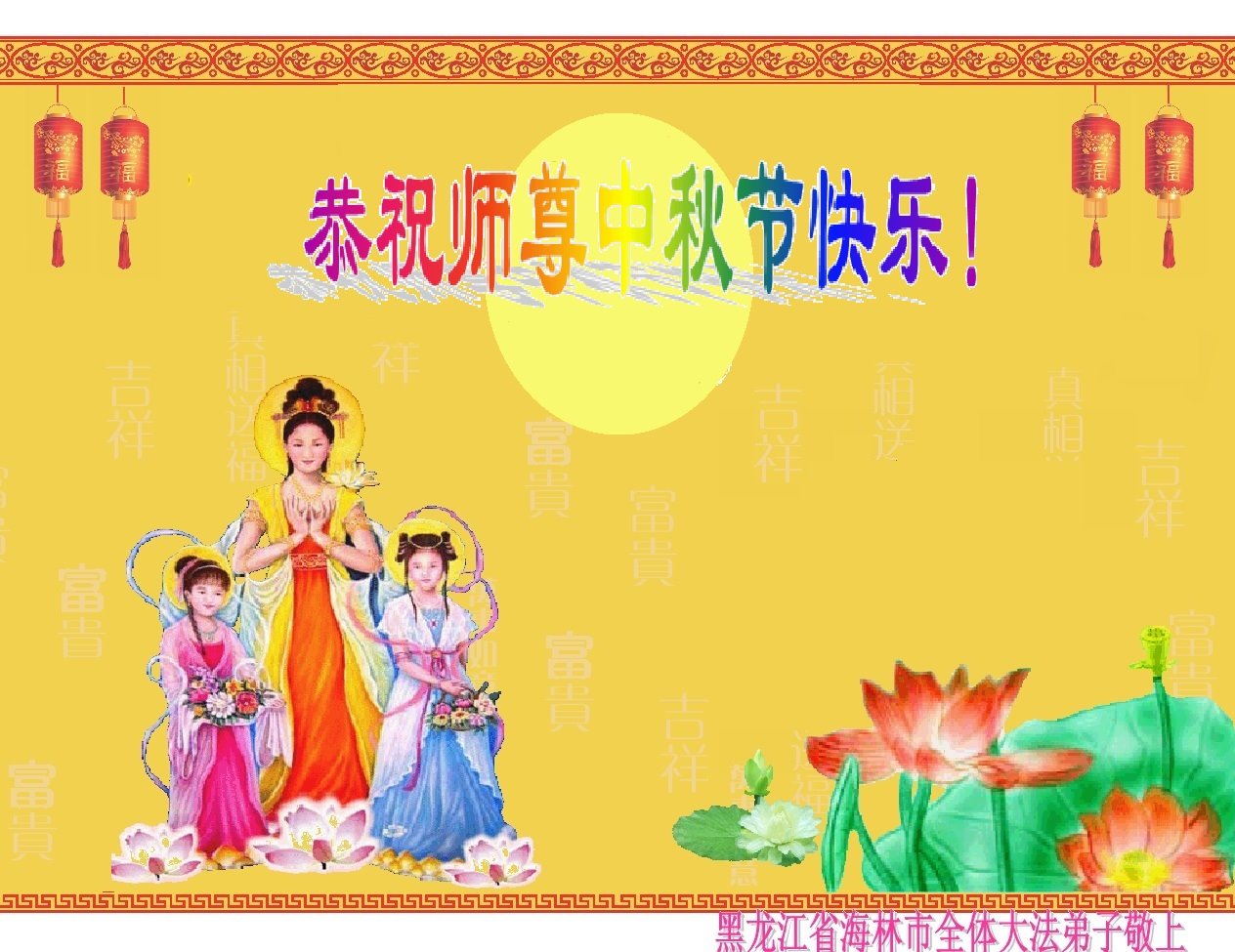 弟子一定努力做好三件事,配合好整体,助师正法,圆满随师还。 海林市全体大法弟子敬上 黑龙江红兴隆大法弟子恭祝师尊中秋节快乐!