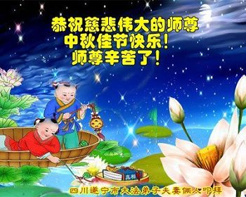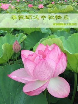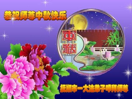 伟大尊敬的师父: 在这中秋佳节即将来临之际,弟子在此遥祝师父佳节快乐! 弟子在修炼中,感谢师父的佛恩浩荡,感谢师父的慈悲苦度,感谢师父的保护。没有师父的承受,就没有弟子的今天。谢谢师父啊! 在以后的修炼中,弟子要更加努力,精進实修。听师父的话,多做师父欣慰的事,做好三件事,唯愿师尊笑,跟随师父把家还。 再:祝师父中秋节快乐! 愿:师父事事如意! 合十 哈尔滨市大法弟子 四川德阳一大法弟子恭祝师尊中秋节快乐!