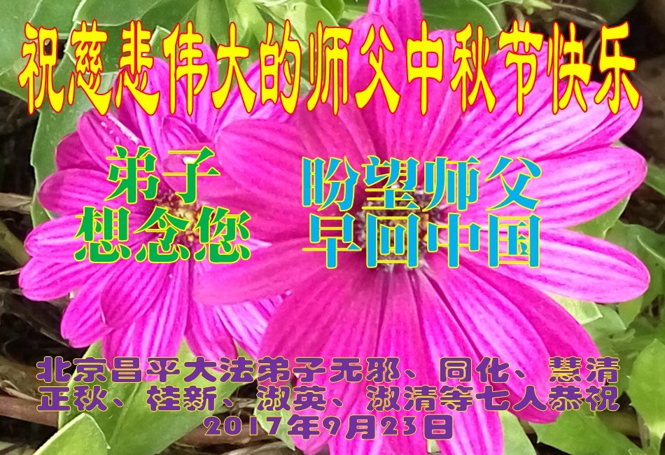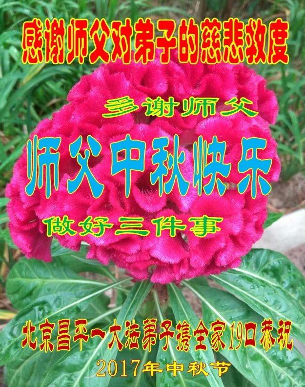 北京昌平城区一大法弟子携全家19口恭祝师父中秋节快乐! 师父好!恭祝师父中秋节快乐!感谢师父对弟子的慈悲救度!多谢师父!弟子一定在正法的最后阶段,踏踏实实的修好自己,做好三件事。 北京昌平城区一大法弟子携全家19口恭祝 2017年中秋节 北京昌平七位大法弟子祝慈悲伟大的师父中秋节快乐!