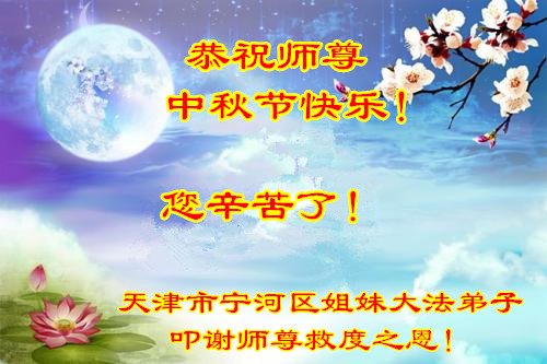弟子叩拜师尊!在传统佳节到来之际,我们九姐妹以万分崇敬的心情恭祝慈悲伟大的师尊中秋节快乐!请师尊放心,我们一定珍惜与师尊同在,与正法同在的伟大的、永远也不会再有的、亘古不遇的机缘。在师尊巨大承受所延续的时间里,我们一定多学法,修好自己才能做好三件事,救度更多世人,一定修去人心,无条件同化真、善、忍,圆满完成师尊对弟子的期望,不辜负师尊的再造之恩,跟师尊回家。 天津市大法弟子恭祝慈悲伟大的师尊中秋节快乐!