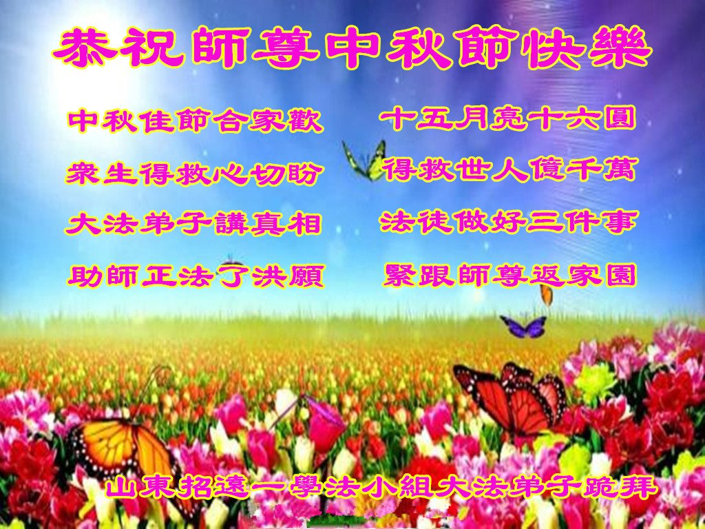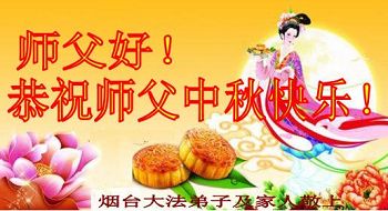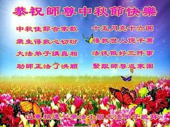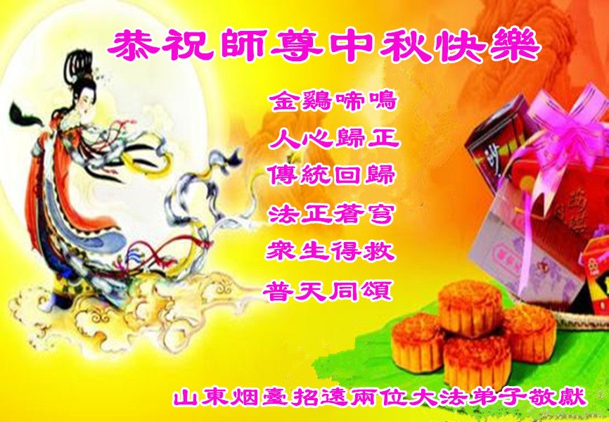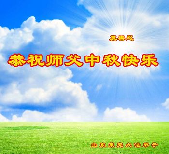 世世轮回观念增 造业大小各不同 今朝得法往回修 洗净救众归天庭 中秋又到谁赏月 广度有缘慈悲生 弟子遥拜师尊好 助师正法到天明 山东淄博市学法小组 祝师尊中秋节快乐! 山东省淄博市全体大法弟子想念师尊! 恭祝师尊中秋节快乐! 山东省淄博市大法弟子 山东省烟台大法弟子恭祝师父中秋快乐!