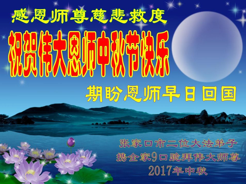 张家口市二位大法弟子携全家9口祝贺伟大恩师中秋节快乐! 祝贺伟大恩师中秋节快乐!感恩师尊慈悲苦度!期盼恩师早日回国! 张家口市二位大法弟子携全家9口跪拜伟大师尊 2017年中秋 河北省张家口二位大法弟子携全家七口恭贺伟大师尊中秋节快乐!