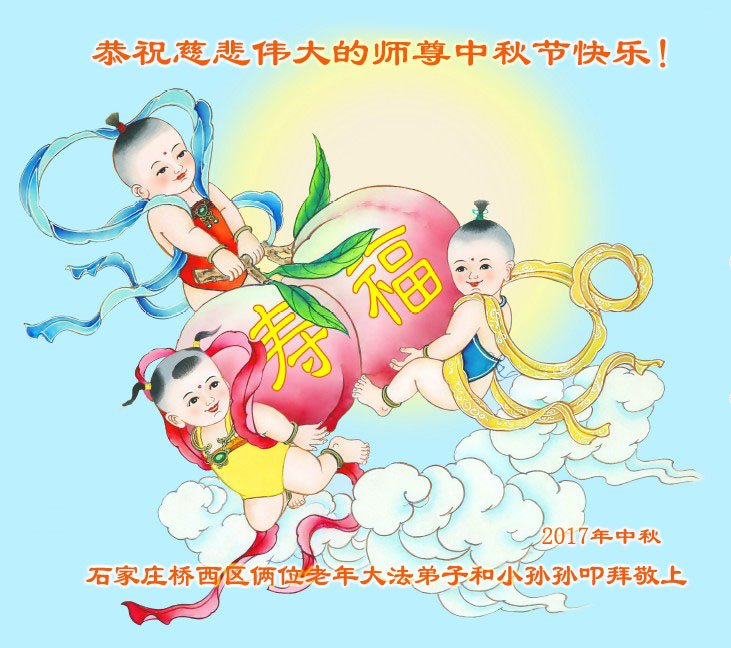 河北省石家庄市桥西区俩位老年大法弟子和小孙孙叩拜敬上 二零一七年中秋 石家庄全体大法弟子恭祝慈悲伟大的师尊中秋节快乐!