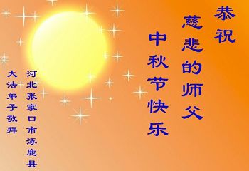 慈悲伟大的师父好! 河北省张家口市涿鹿县全体大法弟子恭祝师父中秋佳节快乐! 在正法最后的时间里做好该做的,多学法,修掉人心和执着,在各方面和细节上实实在在找到差距,用法要求一思一念一行,实修自己,多救人,做好三件事。 河北省张家口市涿鹿县大法弟子恭祝师父中秋节快乐!