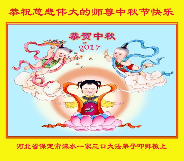 河北省保定市涞水县一家三口大法弟子叩拜敬上 二零一七年中秋 河北省保定市涿州双塔区一学法小组大法弟子恭祝慈悲伟大的师尊中秋节快乐!