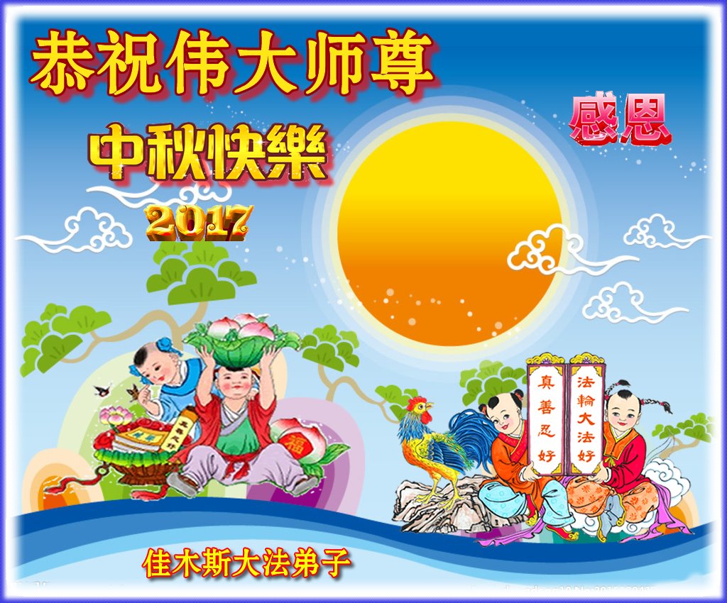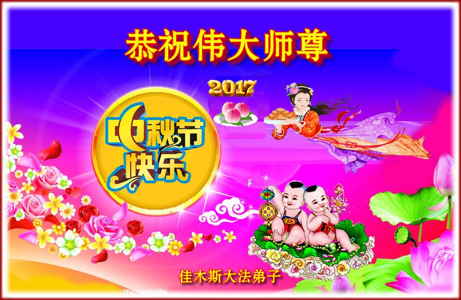 师尊驾法船,扬帆人世间。 法徒上亿万,遍地救有缘。 慈悲讲真相,救人莫等闲。 退出党团队,美好在彼岸。 法轮大法好,人神齐称赞。 叩首谢师尊,报恩永无限。 佳木斯大法弟子 2017 中秋 黑龙江佳木斯大法弟子恭祝伟大师尊中秋快乐!