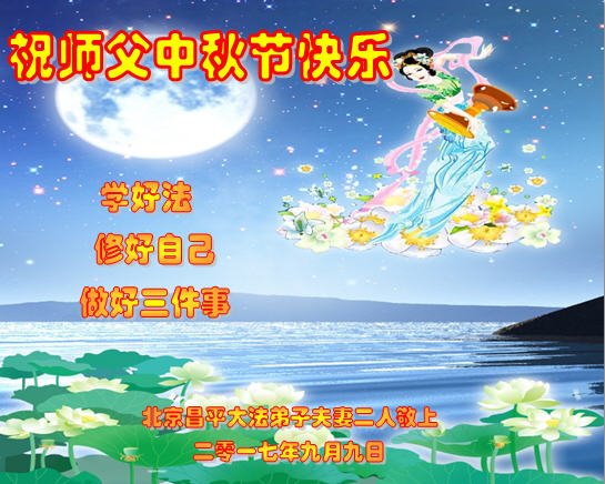 中秋佳节到 遥祝师尊好 惜分分秒秒 去人心重要 时时向内找 救人效率高 三件事做好 师尊才会笑 四川大法弟子华华及全家人恭祝慈悲伟大的师尊中秋节快乐!