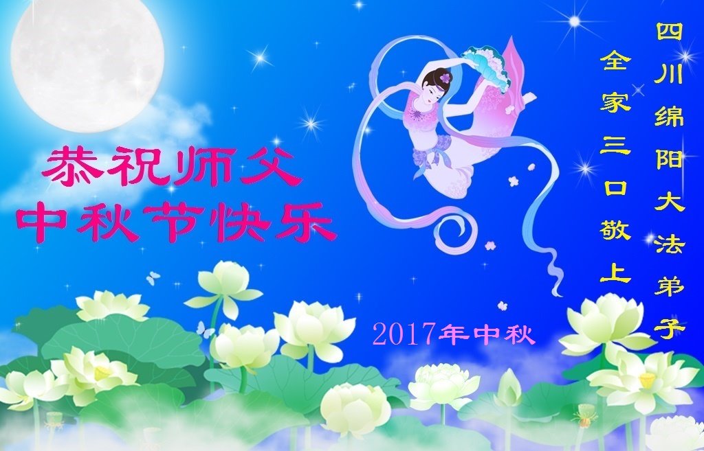 四川绵阳大法弟子全家三口恭祝师尊中秋节快乐!