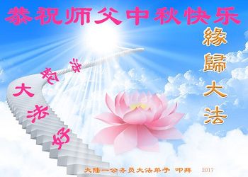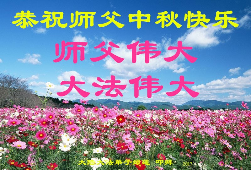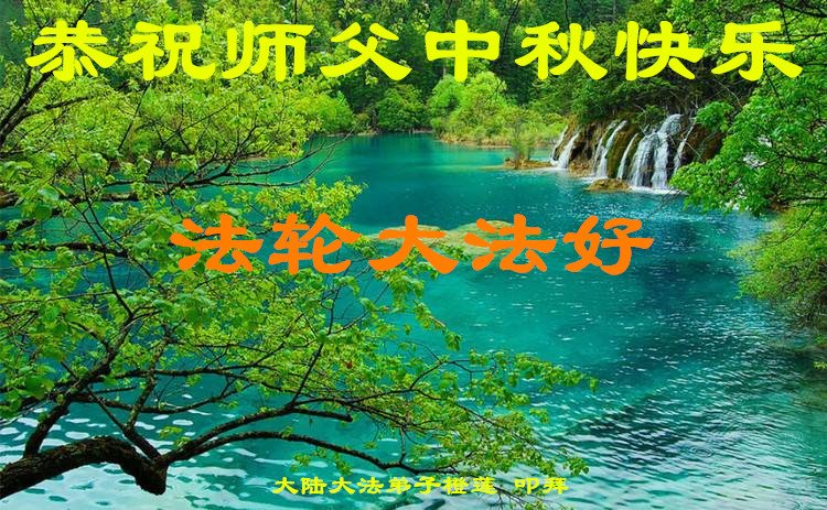 师尊您好!您辛苦了!感恩师尊慈悲苦度!我是96年得法的老弟子,风风雨雨二十年的修炼路走到今天,每一步都离不开师尊的慈悲呵护与加持,感恩师尊一步步指引和点悟我,我才能走到今天;感恩师尊为弟子的付出太多太多,有的弟子知道,而有的承受和付出是弟子们永远都无法知晓。每当我想起这些,感恩的泪水夺眶而出,激动的心情难以言表,更加坚定的走好师尊安排的正法路。请师尊放心,弟子一定在这正法的有限时间内,踏踏实实修好自己的一思一念,无条件同化大法,做好三件事,多救人,完成大法弟子的神圣使命,兑现自己的誓约,跟师尊回家。叩拜师尊! 大陆大法弟子同心恭祝师父中秋快乐!
