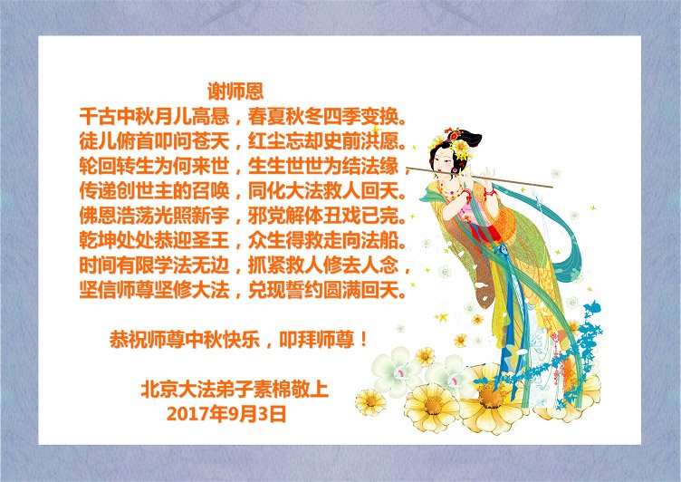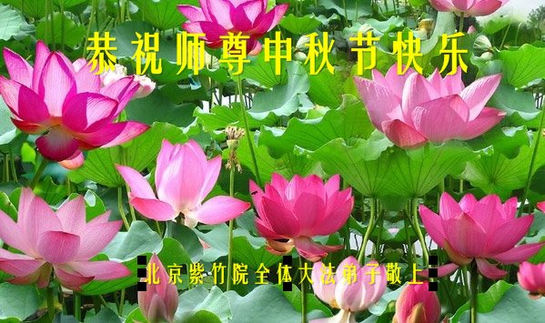 师尊您好!您辛苦了!我是93年得法的老年大法弟子,在这风风雨雨二十年里,无比感恩师尊对我的慈悲苦度!每走一步、每过一关、每一次的学法修心过程都离不开您对弟子的悉心呵护、点悟和加持,弟子时时刻刻都能感到师尊您就在我的身边。走到今天您为弟子承受和付出了太多太多,弟子真是无法用语言形容和表达内心的感恩,唯有老老实实听师尊的话,踏踏实实实修好自己,学好法、多学法,遇到问题找自己、看自己,真正修成无私无我、先他后我的正觉。请师尊放心,弟子在这正法的有限时间里,一定会踏踏实实修好自己的一思一念,做好三件事,多救人、快救人,完成好自己的历史使命,兑现史前誓约,圆满随师还。在此代表全家十口恭祝师尊中秋快乐! 北京大法弟子恭祝师尊中秋节快乐!