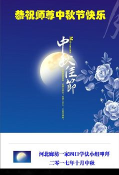 河北廊坊一家四口学法小组恭祝师尊中秋节快乐! 河北廊坊一家四口学法小组叩拜 二零一七年十月中秋 河北省廊坊市霸州胜芳镇一大法弟子恭祝师尊中秋节快乐!