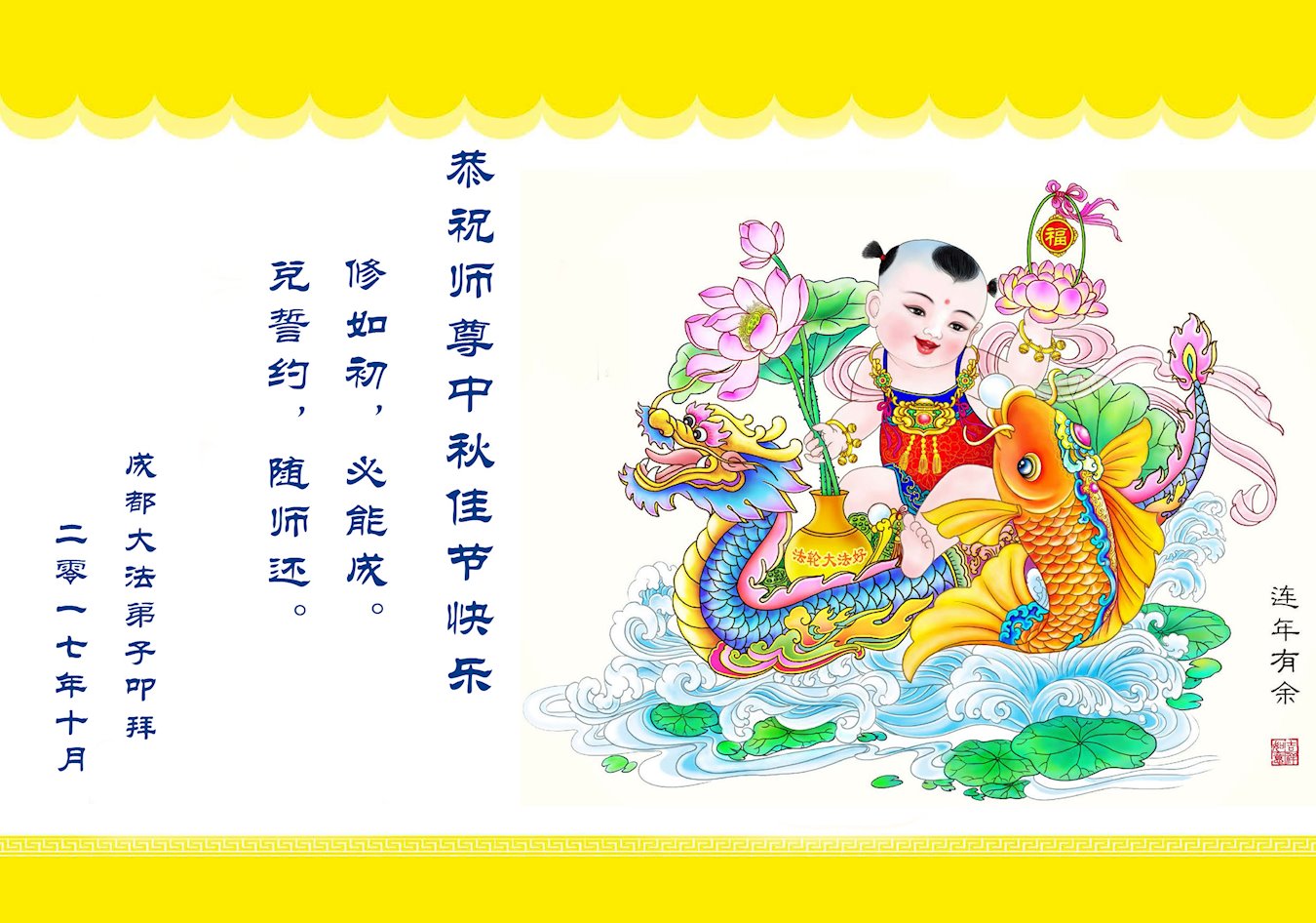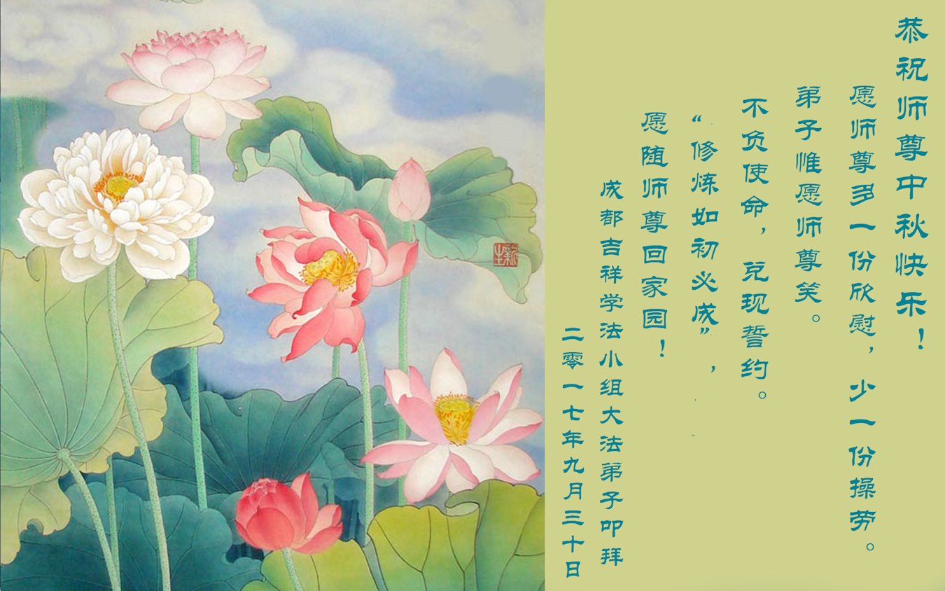 【明慧网二零一七年十月三日】 四川省成都西门一对老年夫妇大法弟子叩首恭祝师尊中秋快乐!