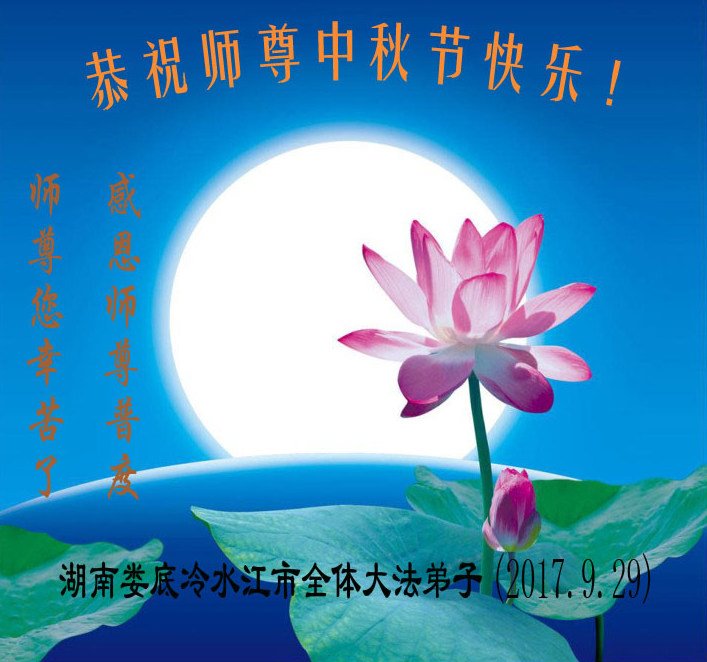 师尊辛苦了!又是一年的中秋到来,弟子思念您。在正法修炼的路上有您的慈悲呵护,弟子才能走到今天。用人的语言无法表达弟子的感恩与思念,唯有听您的话做好“三件事”精進!再精進!踏踏实实的修好自己,圆满随师还。 湖南省怀化市靖州大法弟子跪拜! 2017年9月28日 湖南省娄底市冷水江市全体大法弟子感恩师尊普度!恭祝师尊中秋节快乐!