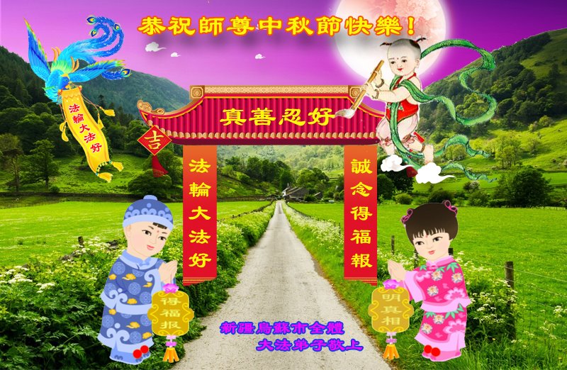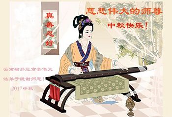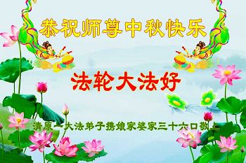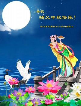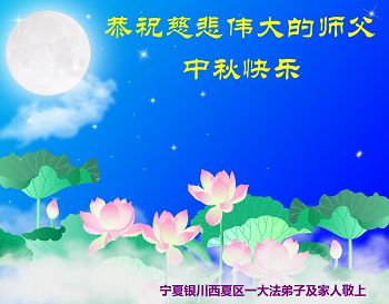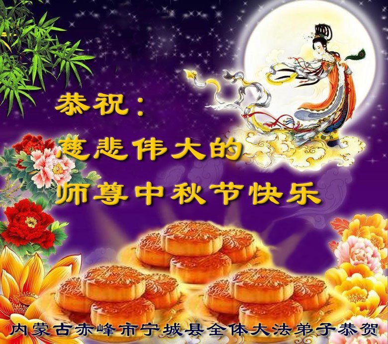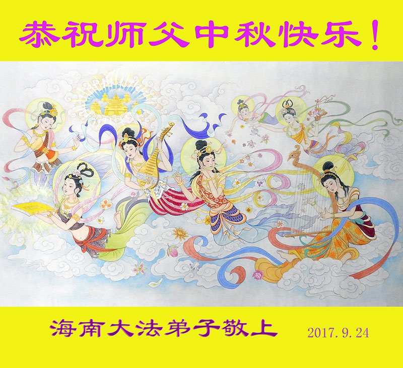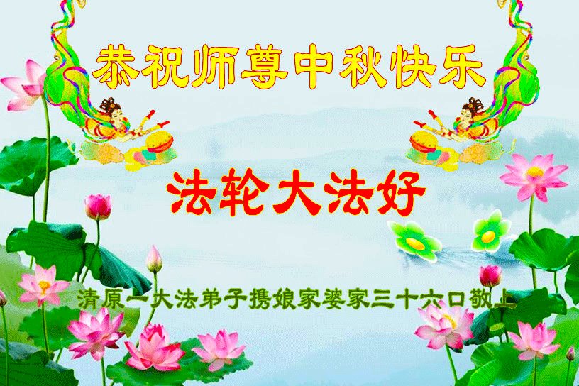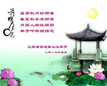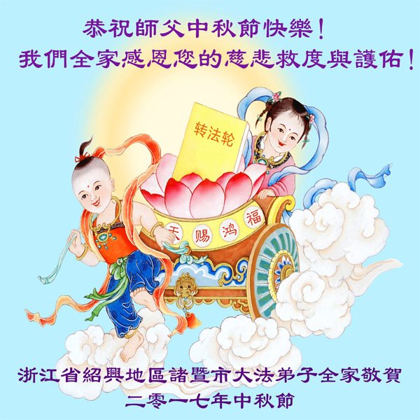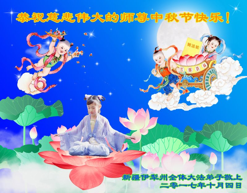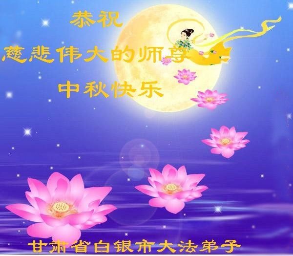 | 【明慧网二零一七年十月三日】中国大陆22个省、4个直辖市、以及广西壮族、内蒙古、宁夏回族、新疆维吾尔自治区的各地大法弟子,在2017年中秋佳节到来之际,感谢法轮大法李洪志师父救度之恩,恭祝师父中秋节快乐! 弟子谨遵师言 学法救人正念 明日随师归位 乾坤清明月圆 团圆佳节倍思亲,在这美好的日子里,大陆大法弟子们思念为众生无私付出、历尽辛劳的慈悲伟大的师尊,我们当精進不停,修好自己,多多救人! 新疆伊犁州全体大法弟子恭祝师尊中秋节快乐!江苏省全体大法弟子中秋谢师尊!创世佛主传天法 末世救度有缘人 宁夏银川市西夏区一大法弟子恭祝慈悲伟大的师父中秋快乐!又是一年中秋时,弟子想念师父。 师尊的慈悲救度与呵护,弟子与家人无法用言语表达。 远隔千山万水,师恩佛恩浩荡,无以为报。 弟子唯有勇猛精進,做好三件事,抓住这最后的机会,全力冲刺!冲刺!再冲刺! 唯愿师尊笑,圆满随师还! 明月千万里,值此中秋佳节之际,借明月遥寄弟子与家人衷心的祝愿! 恭祝慈悲伟大的师父中秋快乐! 弟子在此叩拜师父! 宁夏银川市西夏区一大法弟子及家人敬上! 安徽黄山市全体大法弟子恭祝师尊中秋快乐!感恩师尊危难来前的慈悲救度! 弟子用尽人的语言也无法表达对师尊的无比敬仰与感恩。谨借再青同修的一幅画作《圣莲赞》献给主佛,她代表弟子们真修向善的一颗心。弟子们当精進不停,修好自己,多多救人,圆容师尊所想所要,成为真正的大法粒子。亿万弟子从入道,回归大圆满。 四川省资阳市大法弟子及远方全家恭祝伟大慈悲的师父中秋快乐!永颂法主创世恩 莫道天府蜀道难 师尊救徒返家园 恶浪滔天师导航 沉舟侧畔亿帆扬 深明法理撒甘霖 广传·九·评*除邪灵 遍播福音遍救人 跌倒奋起更精進 心灯炽亮化明星 弟子笃诚紧随师 真正得法同化法 永颂师尊救度恩 红花败落黄花盛 印在金秋已见春 佛恩浩荡救众生 乾坤再造天地新 洪穹欢腾众生喜 永颂法主创世恩 江苏省离退休大法弟子恭祝师尊中秋快乐!望穿秋月盼师尊 春夏秋冬念师尊 月圆人圆佳团圆 弟子叩拜谢师恩 南京玄武区大法弟子中秋谢师洪恩!月桂飘香中秋节 广传大法几多年 助师正法救众归 月圆人圆从返天 辽宁省清原县一大法弟子携娘家婆家家三十六口恭祝慈悲伟大的师尊中秋快乐!山西太原全体大法弟子恭祝师尊中秋快乐!时光荏苒,又逢中秋。山西太原全体大法弟子遥祝师尊中秋快乐! 师尊引领我们走过了十八年的正法征程。在漫漫长夜里,我们虽屡遭凌辱,屡经魔难,但我们有师尊的呵护、有法的指引,终于荡涤阴霾,冲破一切艰难险阻,迎来了黎明的曙光! 救众生是我们大法弟子的神圣誓约,经过亿万年的艰辛付出,才有资格成为一名大法弟子,才有资格助师正法,救度众生。我们今天能够跟师父在一起,那是历史上从来都没有过的至高无上的荣耀! 我们会抓住这开天辟地、绝无仅有的珍贵机缘,抓紧机会修好自己,抓紧时间做好三件事,履行誓约 不辱使命! 回家的路途已不遥远,可谓归期已近。在回归的路上我们太原弟子会互相扶持,不离不弃,一起迈向期盼已久的回家之路! 山西太原全体大法弟子 合十敬祝 二零一七年中秋节 江苏省扬州市江都区全体大法弟子恭祝师尊中秋节快乐!在又一个中秋佳节到来之际,我们江苏省扬州市江都区全体大法弟子,虔诚的恭祝慈悲伟大的师尊中秋节快乐! 团圆佳节倍思亲,在这美好的日子里,我们更加思念为众生无私付出,历经辛劳的慈悲伟大的师尊。在今后的日子里,我们一定牢记师尊的教诲,勇猛精進,努力做好三件事,早日与师尊团聚在佛国仙苑! 扬州市江都区全体大法弟子贺 陕西宝鸡市渭滨区全体大法弟子恭祝慈悲伟大的师尊中秋快乐!弟子们已跟随师尊走过了风雨十八年的正法历程,在这十八年里,我们牢记师尊教诲,整体升华,整体提高。弟子们一定会抓紧所剩不多的宝贵时间,利用一切机会多救人,同时学好法、修好自己,兑现史前大愿,珍惜机缘、珍惜众生、珍惜“正法时期大法弟子”的伟大荣耀!走好、走稳、走正最后的路,请师父放心! 宝鸡市渭滨区全体大法弟子跪拜师尊 双手合十 二零一七年中秋 敬呈 山西大同、忻州和河北张家口三地参与营救同修的大法弟子同恭祝恩师中秋快乐!感谢师父慈悲救度!盼望师父早日回到家乡! 长城喜悦雁门欢 神州救人志坚,中秋思亲祝团圆。 佳节正念劫解,慈悲甘露满人寰。 但愿恩师早归,长城喜悦雁门欢。 新宇洪福无量,吉祥永驻古中原。 山西大同、忻州和河北张家口三地参与营救同修的大法弟子恭祝 2017年团圆佳节 云南昆明西山区一学法小组大法弟子恭祝师尊中秋节快乐!我们一定听师尊的话,学好法,修好自己,完成救众生的使命,跟师尊回家。 福建省南平市全体大法弟子恭祝伟大慈悲的师尊中秋节快乐!云南开远市全体大法弟子恭祝慈悲伟大的师尊中秋快乐!浙江省绍兴地区诸暨市大法弟子全家恭祝师父中秋节快乐!恭祝师父中秋节快乐!我们全家感恩您的慈悲救度与护佑! 新疆乌苏市全体大法弟子恭祝师尊中秋节快乐!广西柳州全体大法弟子恭祝慈悲伟大的师尊中秋节快乐!上海南汇大法弟子恭祝师尊中秋快乐!中秋佳节来临之际,弟子思念恩师,感恩之情无言以表,唯有精進、再精進。 上海南汇原炼功点五位大法弟子恭祝师尊中秋快乐!我们会学好法,做好三件事,兑现我们的