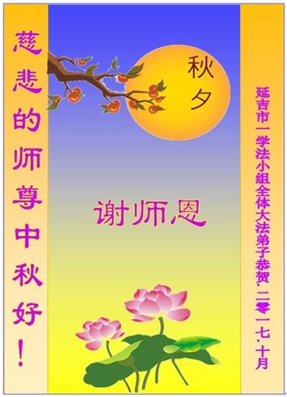 一九九四年八月二十日起我幸运的走進了大法中、成为了大法徒。在生命重塑的二十三年分分秒秒中感受师尊无量的慈悲呵护、加持和为弟子的付出,使弟子能够坚定、平稳的做着大法弟子应该做的三件事。同时生命在法中不断的升华着,弟子感恩师尊,弟子想念师父!唯有精進报师恩。弟子叩拜师尊中秋佳节快乐! 延边大法弟子 吉林、北京、黑龙江三地七名大法弟子恭祝师父中秋节快乐!