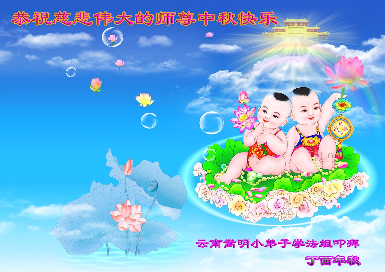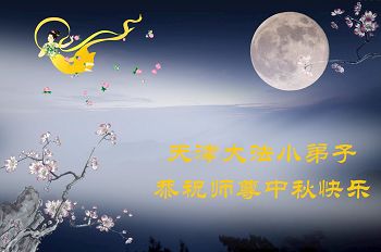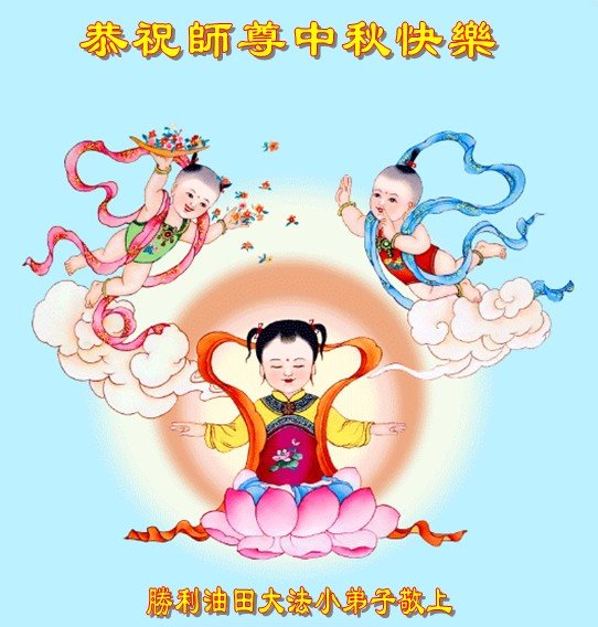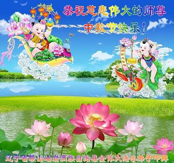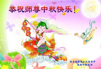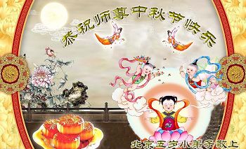 中秋节来临,大陆威海一学法小组十位大法弟子和一位小弟子跪拜师尊:师尊好!请师尊放心,我们一定多学法、多救人,修好自己,随师还。合十 云南昆明一位大法小弟子恭祝师尊中秋节快乐!