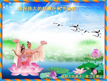 【明慧网二零一七年十月三日】 浙江省杭州大法弟子一家三口恭祝师尊中秋节愉快!