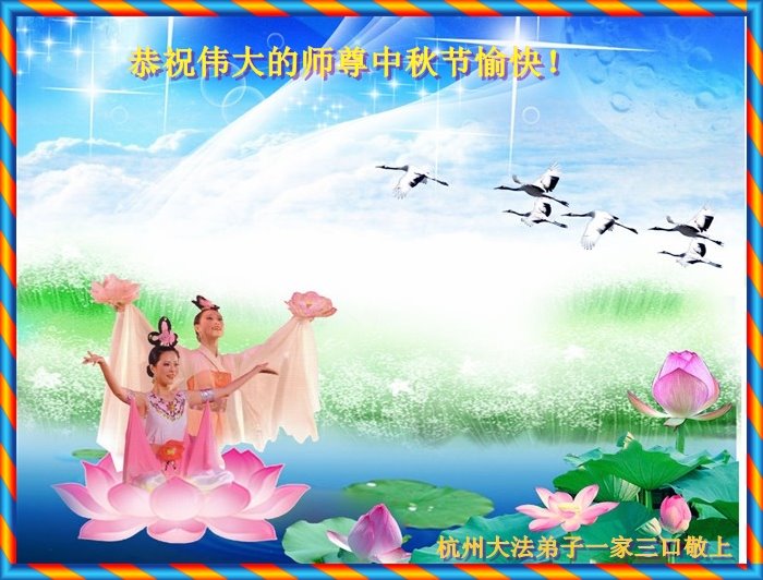 杭州大法弟子一家三口恭祝师尊中秋节愉快! 感谢师尊的慈悲救度。 弟子会尽力做好三件事。 浙江省金华市兰溪市大法弟子恭祝慈悲伟大的师尊中秋节快乐!