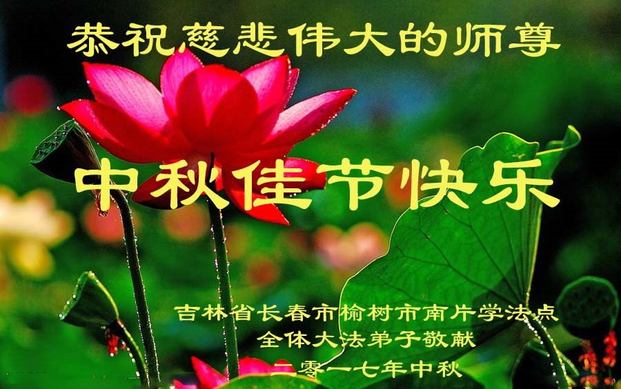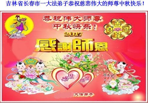 恭祝师尊今秋乐 八月十五云遮月 十七风霜血雨过 乾坤拨正月儿明 恭祝师尊今秋乐 三才感恩齐叩首 众生得救普天贺 吉林省榆树大法弟子 丁酉年中秋 吉林省长春一小组大法学员恭祝师尊中秋节快乐!