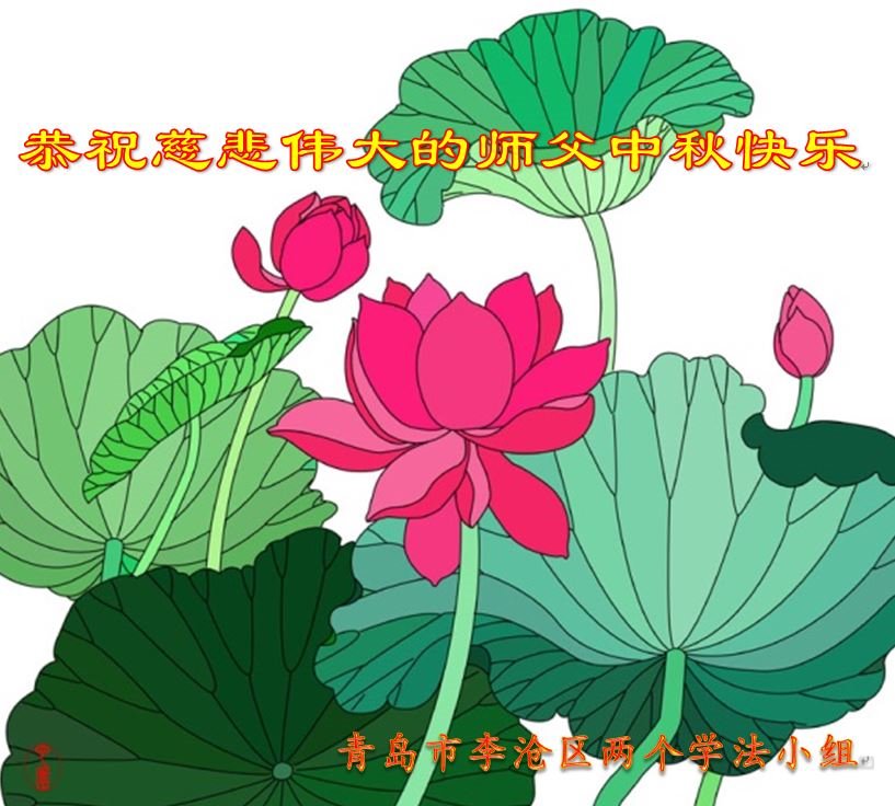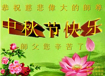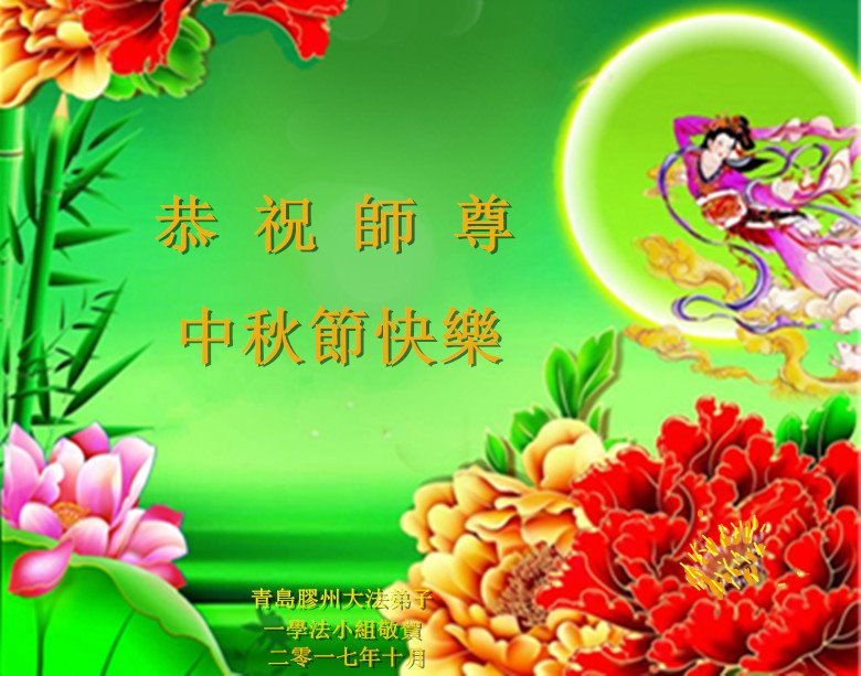 中秋节到了,我们学法小组全体大法弟子向师尊问好祝师尊中秋节快乐! 请师尊放心,我们一定听您的话,做好三件事,走好最后的正法路,迎接师尊早回大陆,早跟师尊回家!再祝师尊中秋节快乐! 青岛三个学法小组全体大法弟子叩拜师尊 山东省青岛大法弟子恭祝慈悲师尊中秋节快乐!