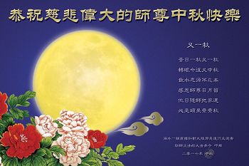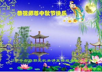 全球电话组营救平台全体大法弟子向慈悲伟大的师父叩拜中秋!恭祝师父中秋节好! 佳节秋月明 天涯共仰月 主佛拯苍宇 法光万象荣 弟子唯精進 三件事为先 整体协调好 多救众生还 海外一组直接针对大陆邪恶進行反迫害、助师正法的大法弟子恭祝慈悲伟大的师尊中秋快乐!