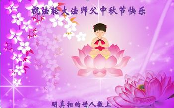 李大师您好!您辛苦了! 谢谢您给了我第二次生命,真是象您的弟子给我讲的那样,明真相与三:退.得福报,在我身上验证了这一点。我明真相以后,天天念“法轮大法好,真善忍好”,这成了我生命中的一部份。 九月份,我从平房上掉下来之时,脑子里闪过九个大字“法轮大法好,真善忍好”瞬间安然无恙,我知道是您在我危难之时救了我,给了我第二次生命,使我又有了平静的生活,我无法报答您的救命之恩,只好借中秋节来临之际,祝慈悲伟大的李洪志大师中秋节快乐,谢谢您给了我这一切。“法轮大法好!真、善、忍好!” 愿您早日回来! 明真相世人一家三口敬上 明真相的世人祝法轮大法师父中秋节快乐!