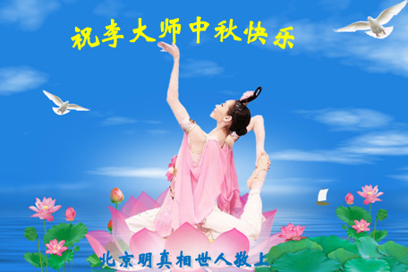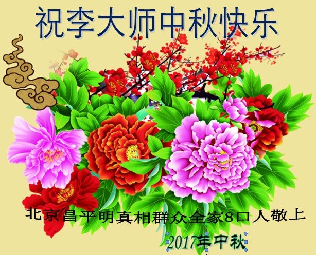 大法师父您好!您辛苦了! 谢谢大法师父给了我明真相和祝您中秋节快乐的机会,这是我人生当中最大的幸事,在这个人类道德及其败坏的社会,您让我选择了正义,您让我明辨了是非,不再推波逐流,这才是我要的。 “法轮大法好,真善忍好。”谢谢法轮大法师父为我所做的一切,我相信中共坏事做绝,一定会自取灭亡。我永远支持法轮大法和法轮大法弟子,愿您早日回到中国大陆,您是众生的希望! 明真相的世人敬上 北京大法弟子家属祝法轮大法师父中秋节快乐!
