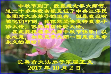 中秋节到了,我真想念李大师啊! 这二十多年我亲眼见证了中共江泽民集团对大法弟子的迫害,但是我没有被它们吓倒,我依然坚决支持我妻子修大法,依然相信法轮大法。 在此我祝李大师中秋节快乐!以表心意,如能见李大师一面是我生命永久的期盼! 长春市大法弟子家属正义 2017年10月2日 山东一名法律工作者恭祝大法师父节日好!