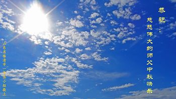 恭祝: 慈悲伟大的师父中秋节快乐! 师父慈悲大法传 冲破万阻宙宇蓝 朵朵祥云喜相伴 福泽万物至永远 值此金秋佳节时 共祝愿: 慈悲伟大的师父 中秋佳节快乐! 山东泰安大法弟子恭祝慈悲伟大的师尊中秋节快乐!