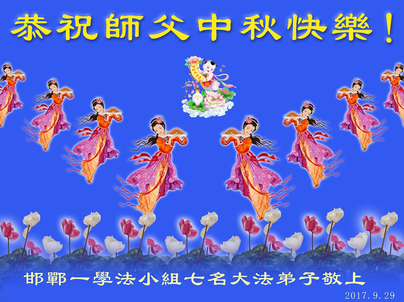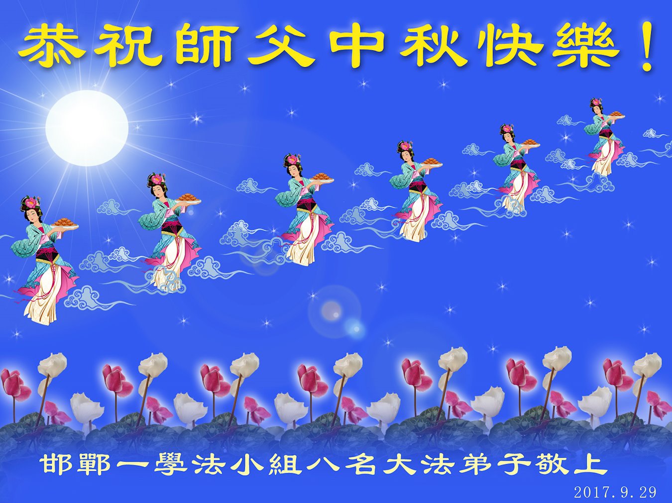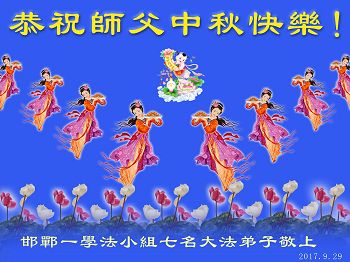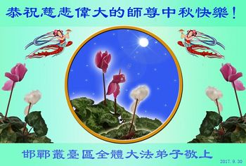 【明慧网二零一七年十月四日】 河北邯郸市复兴区一学法小组叩拜师尊恭祝师尊中秋节快乐!