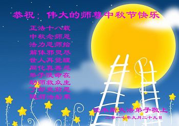 弟子多学法、学好法,修好自己,整体配合多救人,早迎师尊回大陆,普天同庆大团圆! 黑龙江省佳木斯市桦南县全体大法弟子恭祝慈悲伟大的师尊中秋快乐!