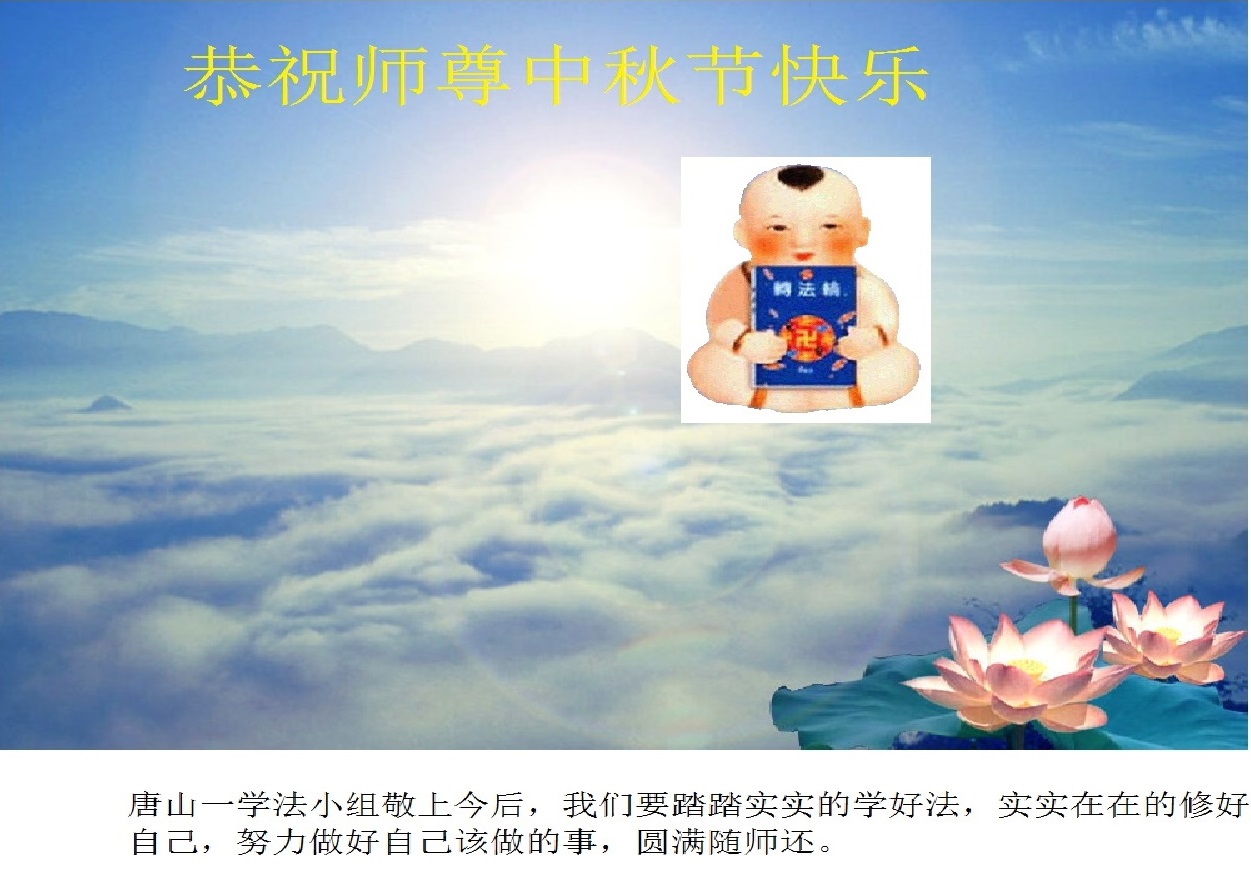 在这救度众生的紧急时刻,弟子要踏踏实实认真做好三件事,认真学法、背法,学会向内找,不气馁、不懈怠,多救人,不负师父慈悲苦度。玉田县大法弟子叩拜! 河北唐山玉田县大法弟子叩拜师父中秋节好!