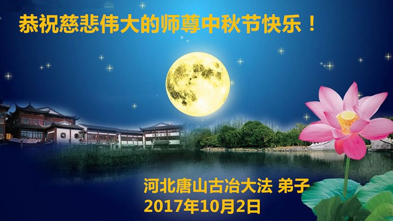 弟子们感恩师尊慈悲救度,全力救人。虽然道路坎坷,但是我们坚信师父、坚信大法,我们做的越来越好! 恭祝师尊中秋快乐! 2017年10月2日 河北省唐山一学法小组大法弟子恭祝师尊中秋快乐!