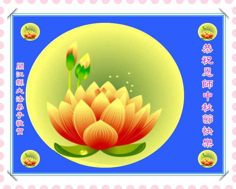 师尊:您对弟子的呵护,对弟子的给予,对弟子的付出,我能感受到点滴,更多的我根本无法感受和知道。因为我知道我现有的语言无法描述,现有的思维无法想象。但我深深知道,唯有精進实修,遇事向内找,做好三件事,多救人,才是对师尊最好的回报。弟子想您,想跟您回家,希望师尊早日回归中国,回归家乡。值此中秋佳节临近之际,弟子在此叩首遥祝慈悲伟大的师尊中秋节快乐!合十! 四川德阳大法弟子恭祝慈悲伟大的师尊中秋快乐!