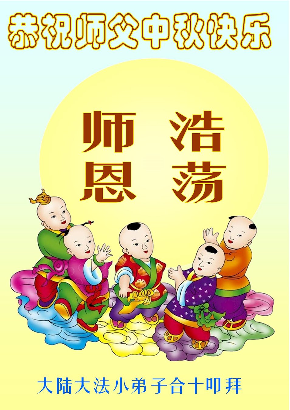 大法弟子A:感谢师父的慈悲苦度,唯有精進实修,做好三件事,功成圆满,跟师父回家。 大法弟子B:尊敬的师父您好!恭祝师父中秋节快乐!感谢师父的慈悲苦度,弟子一定努力做好三件事,圆满随师还。 大法弟子家属:师父您好!祝师父中秋节快乐!幸福,希望师父早日回归祖国。 大法弟子家属:尊敬的师父您好! 明月,一闪一闪,挂天边; 中秋,一年一年,盼团圆, 恭祝师父中秋快乐! 我们盼望早日见到师父! 八岁大法小弟子:师父您好!祝您中秋节快乐! 河北大法弟子全家祝师尊中秋好!